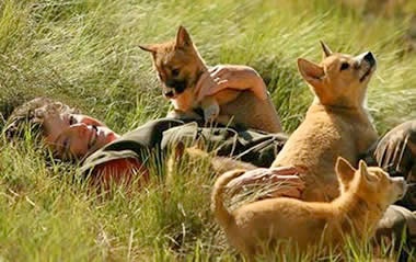 In her element, dingo expert Lyn Watson surrounded by dingo pups at the Dingo Discovery Centre at